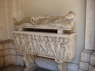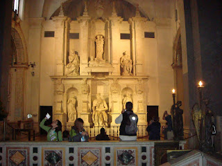 After lunch we walked around the area and went into a local church called St. Mary and Martyrs (there were several, and I shortened it for my notes and now can't remember the rest). It was originally the Diocletian Baths, but all of that area is under renovation. The church itself was designed by Michelangelo, but time and wars have erased most of Michelangelo's imprint. My favorite part of the church was the nave pictured below. It is all painted, but from a distance looks so three dimensional that I walked over to have a look at the beautiful marble.
