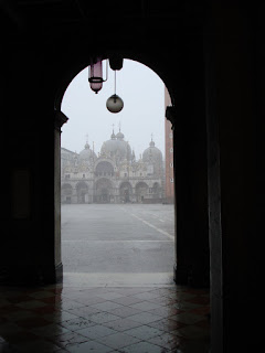 The next morning we woke up, went into the city with our group and toured the St. Mark's Cathedral. I wish I could have taken pictures of this place because it was truly amazing. There are mosaics everywhere. Every single square inch of floor, ceiling and walls are covered in tiny glass pieces arranged to tell a story. Sparkly, pretty and wonderfully overwhelming. There was a choir in there that day and the music gave me chills. We also saw the golden altar which was quite golden and shiny. Definitely worth the Euro.fifty we spent to see it. Then we walked up the steps to see the bronze horses (which were also pretty cool) and ended up watching a military review in the square from the balcony. That was cool. Some of the frescoes were also on the outside. A picture of one.