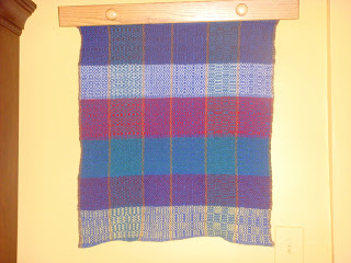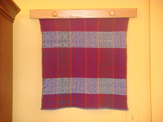 I wanted to do a gamp after seeing samples of them in several of the pattern books. A gamp is basically a sampler. You thread rows according to different threadings (in this case 6) and then treadle (weave) using the treadling for each threading patterns, thus creating 6 rows. Two 6X6 gamps were thus created on one warp using harrisville shetland wool. David's is the multicolored one. The red and white one will grace the walls of our living room.