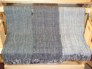 One for my hairdresser and two for sale! These are made from the same soft and slinky yarn that I made grandma's all black one. The warp is the same for all three (saved myself some time and money!) and uses al lthree colors, green, black and white randomly placed throughout. The weft is different for each one--L-R, green, black and white. Hope they sell!