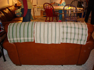 And three scarves on the same velura warp. Alyssa's is dark green, Elizabeth's is purple and mom's is dark green and white. Mom's was finished at 9pm the night before I left. I was worried it would be dry in time, but it was.