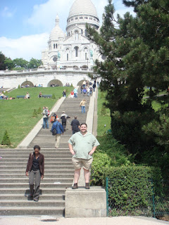 We ate lunch at a place called "The Post Office." I had a roasted chicken and potatoes and David had roasted duck with garlic potatoes. We had planned to ride the funicular to the top, but the line was extremely long and we decided it wasn't that bad of a hike to the top, so off we went taking a few flights at a time and resting.  The grounds are gorgeous with gardens and before you know it you're at the first landing with a commanding view of Paris.